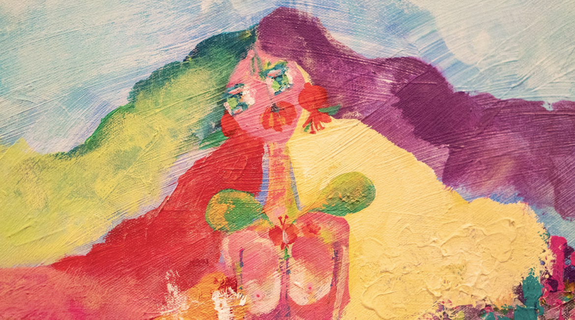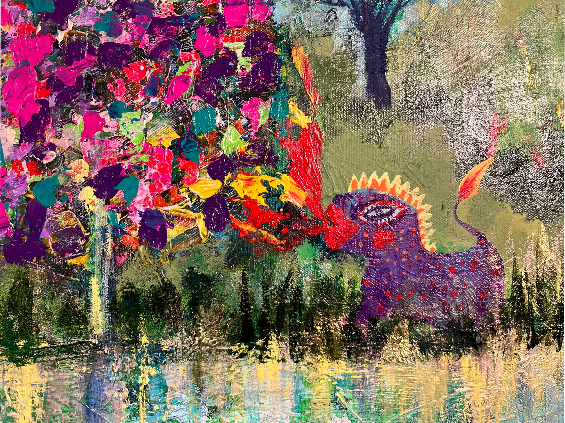A vibrant and imaginative piece featuring a pink house surrounded by fantastic flora and magical garden elements. This painting brings joy and wonder to any space with its playful use of color and dreamy composition.